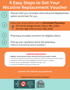 - The Nicotine Replacement and Non-Nicotine Therapy Voucher Program can be accessed without an appointment, Monday – Thursday, from 10 a.m. to 3 p.m., by sending your prescription to a participating pharmacy. The Northside Pharmacy can be reached at 410-398-3784.